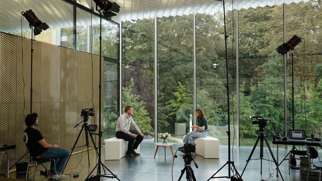 Interviews opnemen tijdens een beurs of conferentie? Een unieke locatie in de kijker zetten? Met onze mobiele sets bouwen we in een mum van tijd een tijdelijke studio op.
